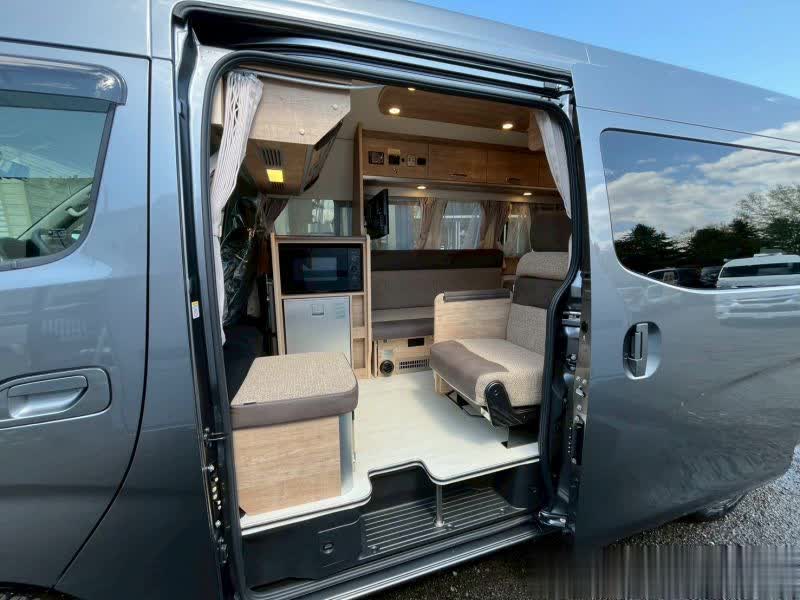 这台日产NV350露营车,柴油2.5升排量,配有四驱系统,能源充沛通过性更好。后置厨卫筹划,里面座椅多变,转机空间大,床位可以睡下多东说念主,车内有基本的水电生计法子,稳健小家庭近郊旅愚弄用。