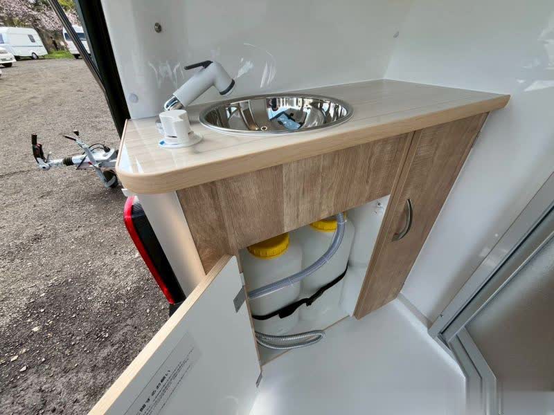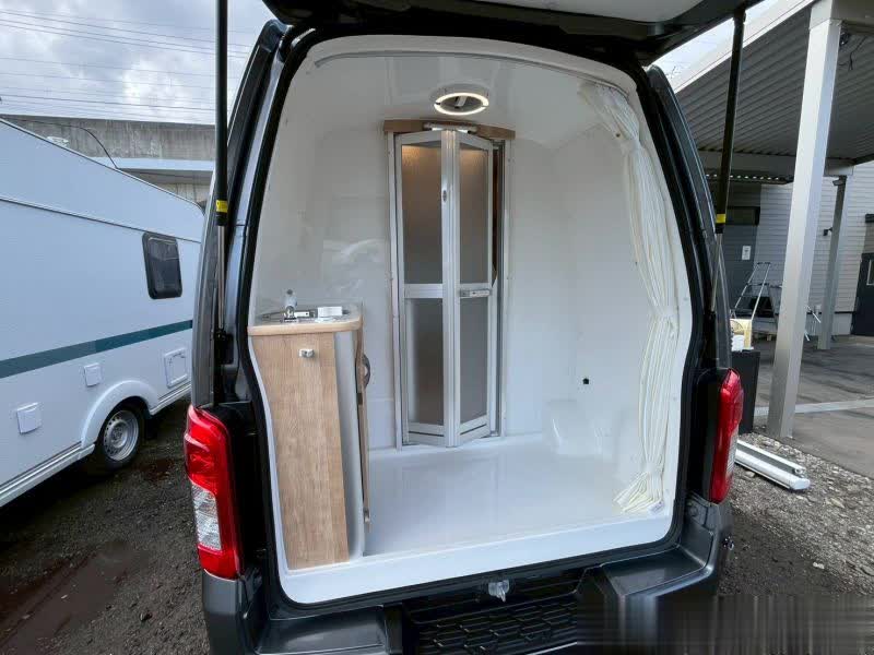 整车尺寸,长度:5080mm,宽度:1695mm,高度:2400mm,车身为灰色涂装。中门为单侧滑门,右侧莫得车门,闭塞现象,尾门为后翻盖式开启,可以看到后部的厨卫区域,左侧的柜子上有洗漱盆和水龙头。