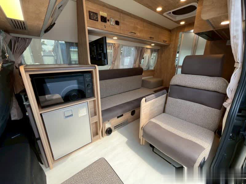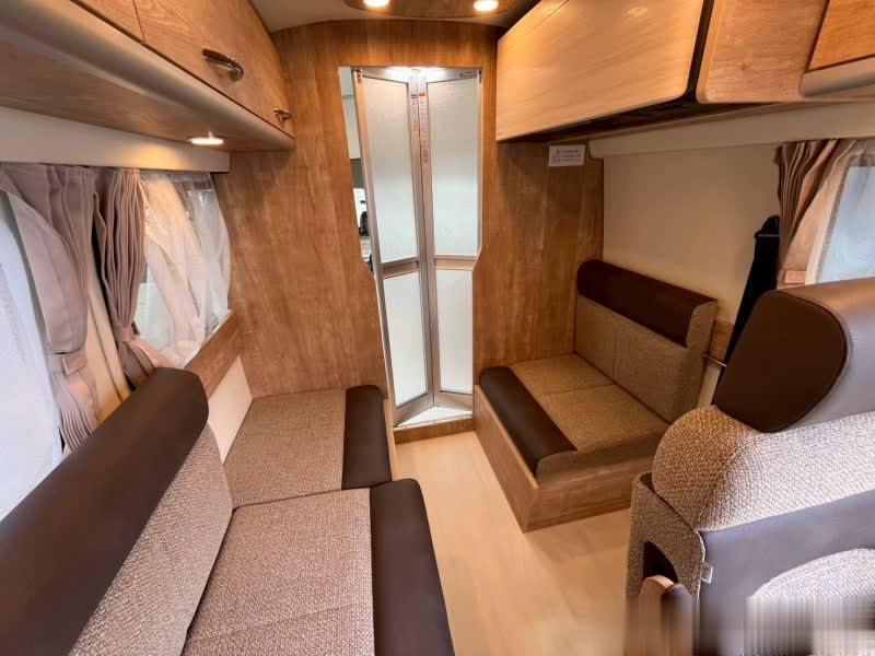 掀开侧滑门,来到车内,门口右侧是一个翻折座椅,对面是一个临时座,亚搏再往里走是吧台,和一组长条沙发,车内莫得固定床位,需要将沙发和座椅拼床智商休息。